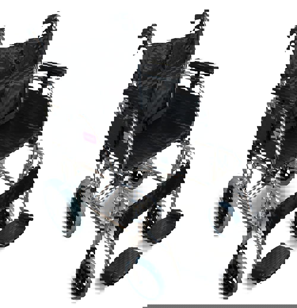 The York Attendant Propelled Transit Chair has a powder coated frame and features a flip up armrest. It includes a deluxe nylon upholstery seat, detachable footrests, PVC footplate, united hand brakes, 7. 5 inch PVC castors, and 12 inch rear wheels.