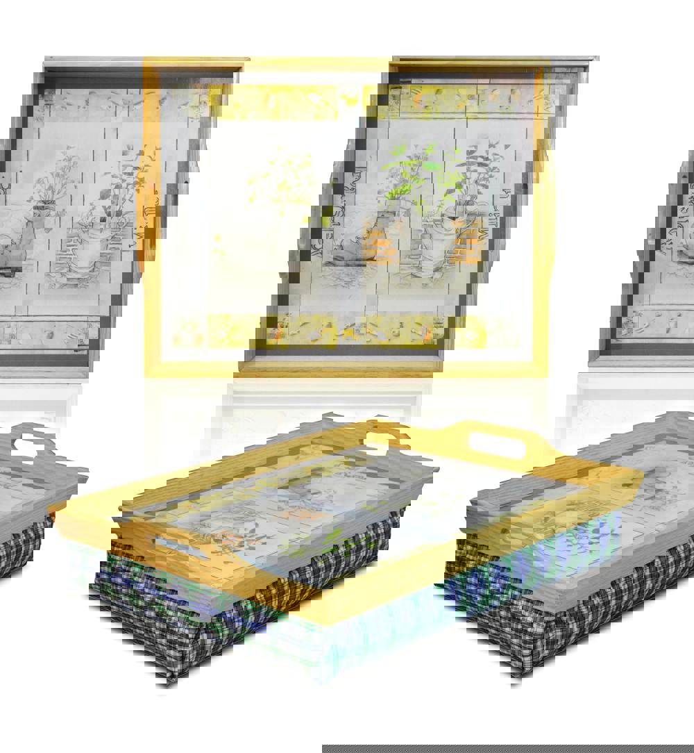 This attractive and functional Lap Tray makes breakfast in bed, reading, writing and crafts easy and comfortable. The lap tray has a built-in cushion below the tray top, finished in either tartan fabric or plain beige, so will rest comfortably on your legs while you lie or sit. The table top surface has a pleasant design that will suit both modern and traditional homes and is laminated for easy cleaning. With built-in handles to more easily carry and position the Lap Tray.