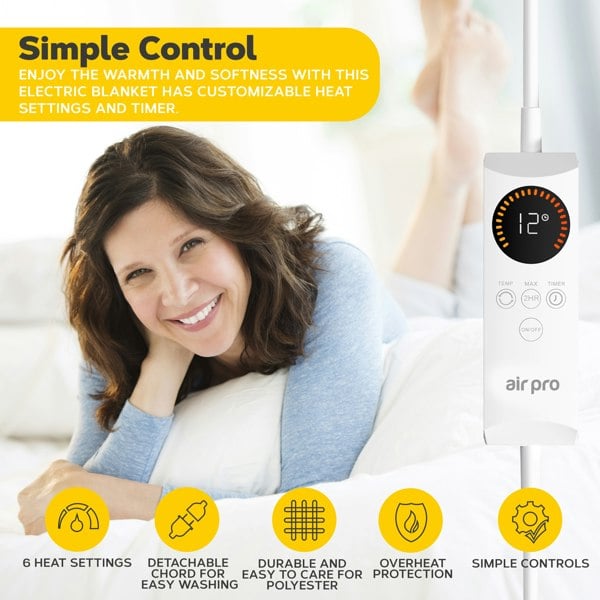 Perfect Size with Easy-To-Fit Straps: The Air Pro Electric Blanket is fitted with 4 flexible elastic straps on each of the blanket’s corners and comes in 5 size options for the ideal fit for your bed. The blanket features efficient and even heating, ideal for relaxing your aching muscles and getting restful sleep.