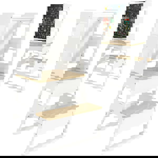 This toddler tower also features a built-in blackboard, giving children a dedicated space to draw and scribble. A trapezoidal structure and integrated safety rail are included to support safer use while children step up and take part in activities at a more comfortable height.