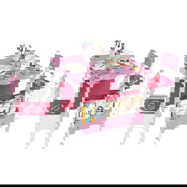 The AIYAPLAY kids toddler table and chair set lets creativity flourish. Bright pink with heart shapes, it creates a fun space for drawing, reading, eating and playing. Dual book racks keep favourite books within reach, encouraging reading. Made from MDF with rounded edges, it's smooth and secure with no sharp corners. Its child-friendly height promotes good posture and comfortable sitting. Turn creative chaos into an organised hub, keeping books tidy and mess away.