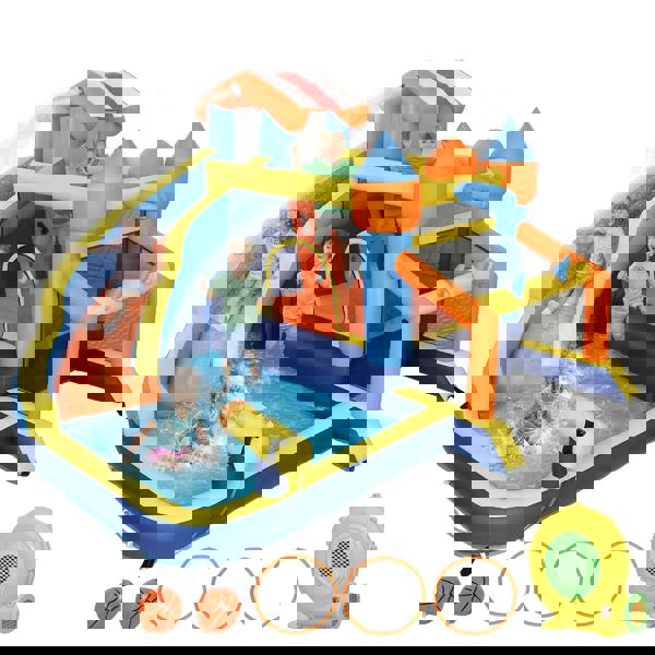 Bring endless fun to your garden with the AIYAPLAY bouncy castle! Kids can jump on the trampoline, slide down, climb the wall, splash in the pool, use the water blaster, shoot hoops, score goals and toss rings. Made with robust Oxford fabric and reinforced seams, this inflatable bouncy castle inflates in 1 minute with the included blower and comes with all accessories. Great for parties, summer water play, or year-round fun—hours of excitement for kids of different ages!