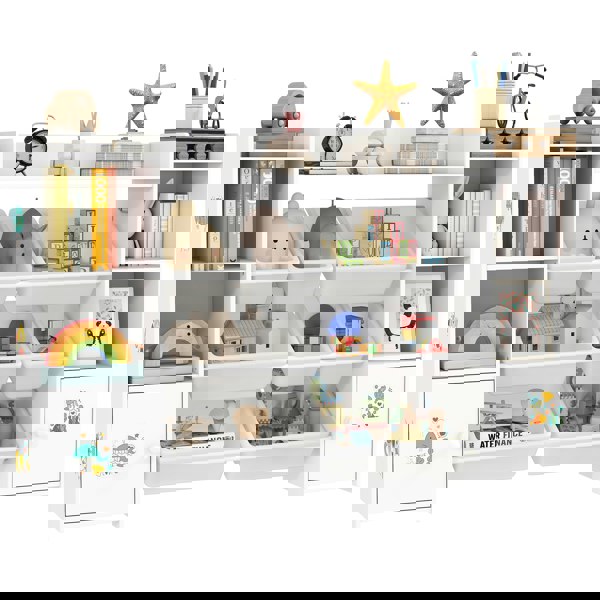Transform your child's play area with the AIYAPLAY 3-in-1 kids bookshelf and toy storage! This versatile piece features a toy shelf with eight removable bins, a spacious cupboard and bookcase sections. Encourage self-organization with fun DIY stickers, all at a child-friendly height. Suitable for any playroom, its rounded corners offer safety, crafted from MDF and steel.