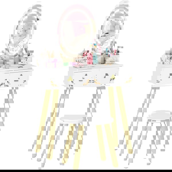 The AIYAPLAY kids dressing table offers the gift of independence. Great for morning routines, trying new hairstyles, makeup fun or creative play, it features a mirror with touch-activated LED lights – warm, natural and cool white – to perfectly illuminate their face. Two large drawers provide storage to keep supplies and accessories organised, eliminating clutter worries. Made with solid MDF and round edges, it provides a safe space for little ones to explore their creativity independently.