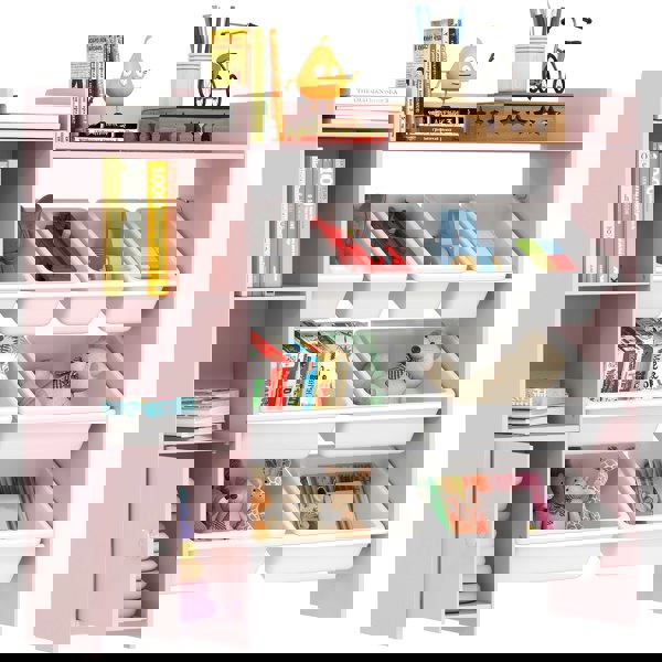 Organise your child's space with the AIYAPLAY toy storage unit! Designed for little ones, this charming unit features eight bins, two grids and a spacious top, transforming scattered chaos into organised order. Crafted from strong MDF and steel, it's a stable home for all their treasures, whether in the nursery, playroom or bedroom. Say goodbye to clutter and scattered toys – now they can enjoy a tidy, organised space with all their favourite items in one place.