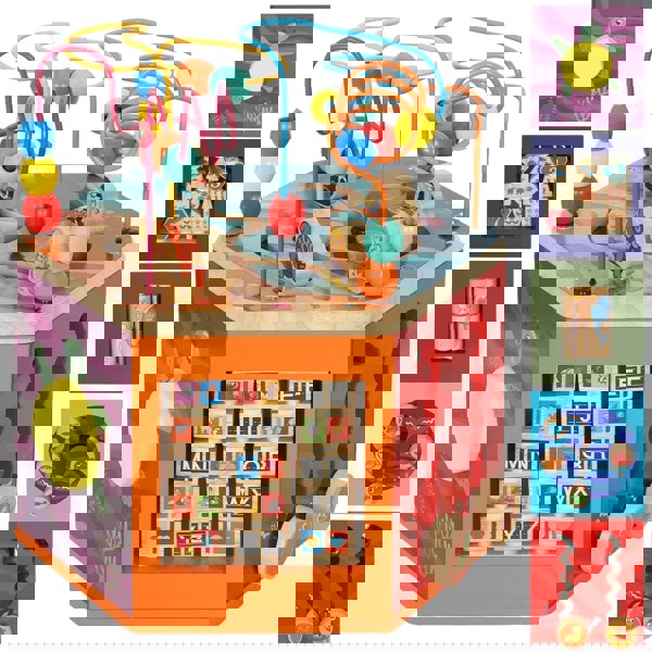 The AIYAPLAY wooden activity cube makes learning enjoyable with dedicated sides for numbers, shapes, the alphabet and colours, plus a bead maze on top. Crafted from solid wood and MDF, it's smooth and secure, with no sharp edges. This all-in-one cube is designed to educate, engage and excite, making skill development super fun.