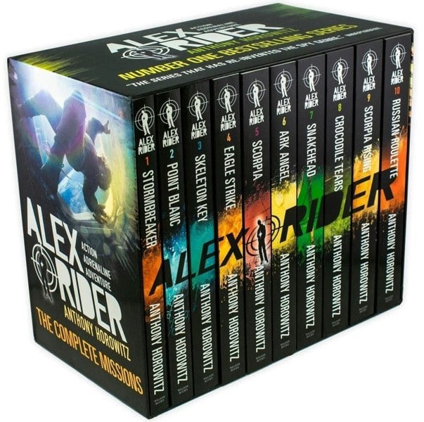 Alex Rider 10 Books Collection Box Set by Anthony Horowitz brings together ten adventures from the bestselling series, following fourteen-year-old Alex Rider as he is drawn into dangerous missions connected to MI6 and other security services. Across the collection, Alex is repeatedly forced to go undercover, pursue attackers, and uncover hidden plots that take him from Britain to Europe, Cuba, Australia, South-East Asia, North Africa and Cairo.