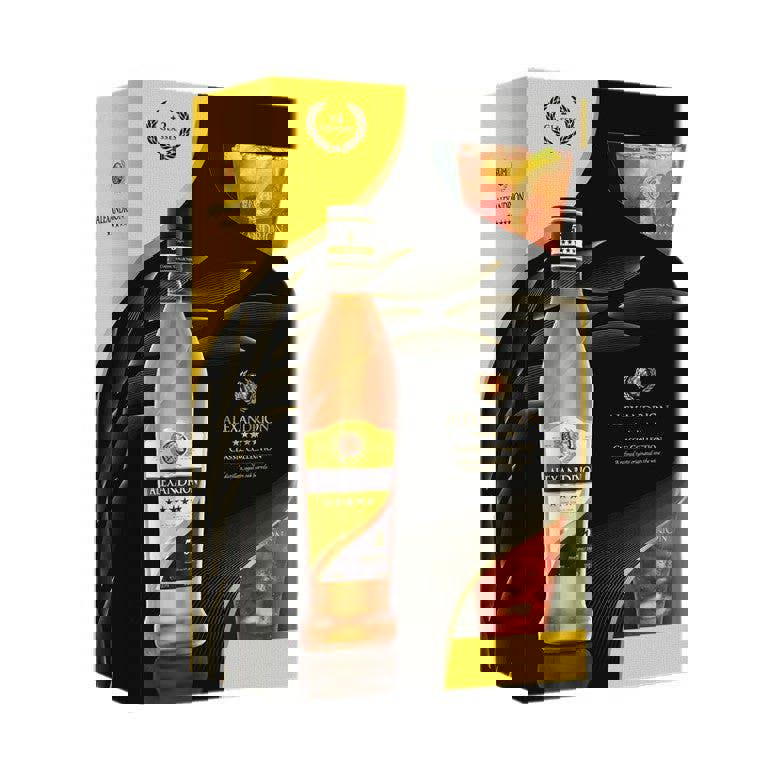 From Alexandrion, the 5* Romanian Brandy is a smooth, well-balanced Brandy gift set, created from aged wine distillate and designed for enjoying neat or mixing into cocktails. A secret bouquet of natural extracts brings delicate Mediterranean aromas alongside notes reminiscent of oak wood, giving it a rounded character suited to relaxed sipping and more considered serves.