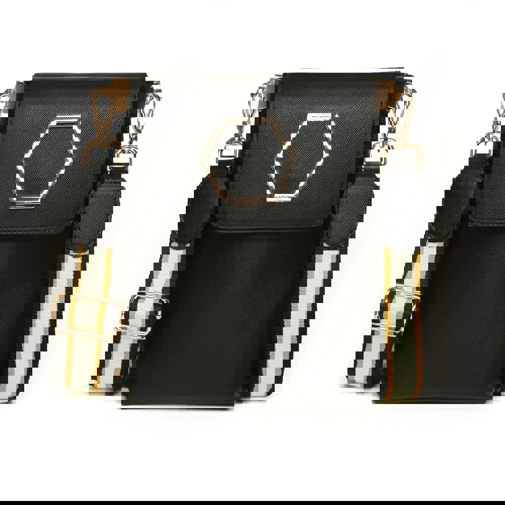 This compact and structured design is ideal for carrying your day-to-day essentials, with a main compartment to hold your phone, purse, and keys, and a rear slip pocket for quick-access items. The bag is secured with a magnetic flap closure and finished with a wide, patterned woven strap, which is both adjustable and removable for versatile styling.