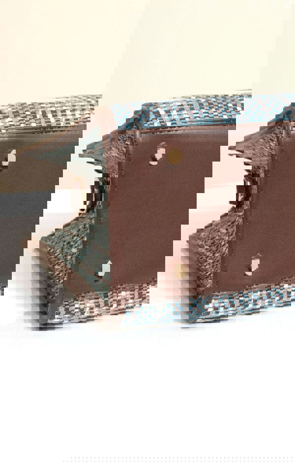 Offering a luxurious blend of blue, brown and cream tweed and framed in a dark brown, faux leather trim