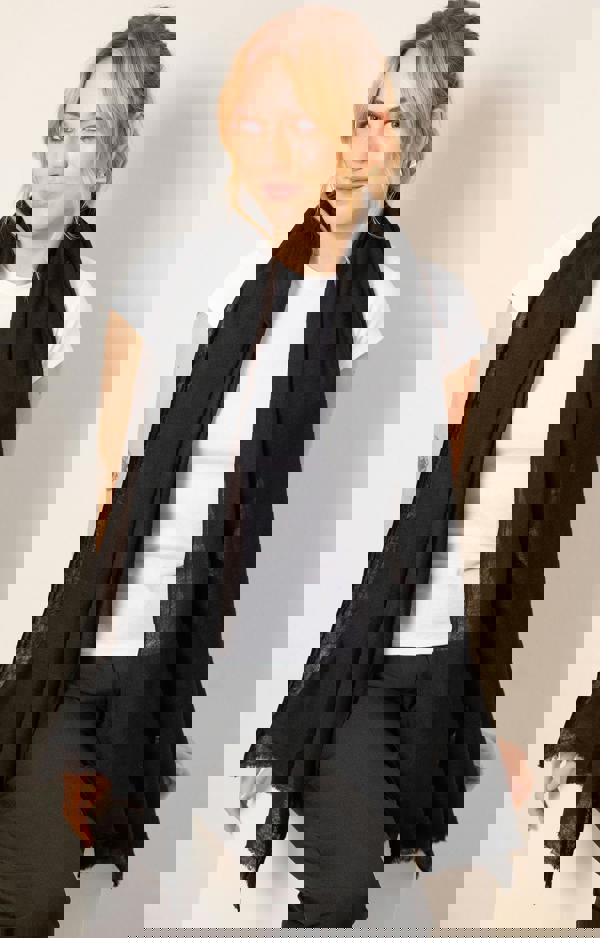 The elegant black shade pairs seamlessly with virtually any colour palette, making it easy to style across seasons. Its generous length allows it to be wrapped comfortably around the neck, draped over the shoulders or layered with coats and knitwear for added warmth and style.