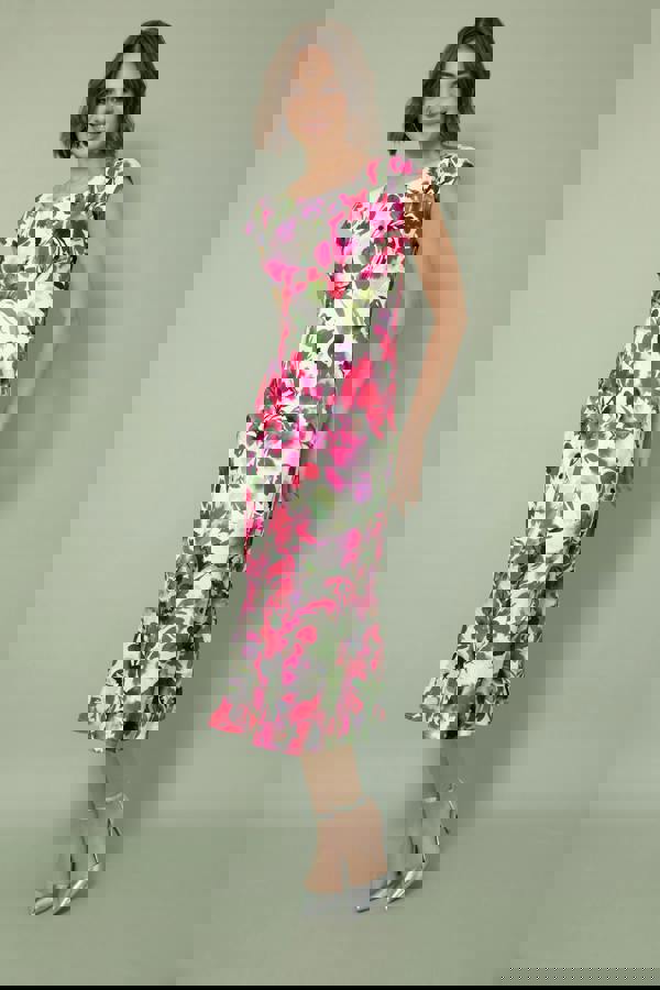 Make a statement in the Clara Dress in Fuchsia Florals. This beautifully feminine style features a vibrant floral print in shades of fuchsia, pink and green on a soft ivory base.