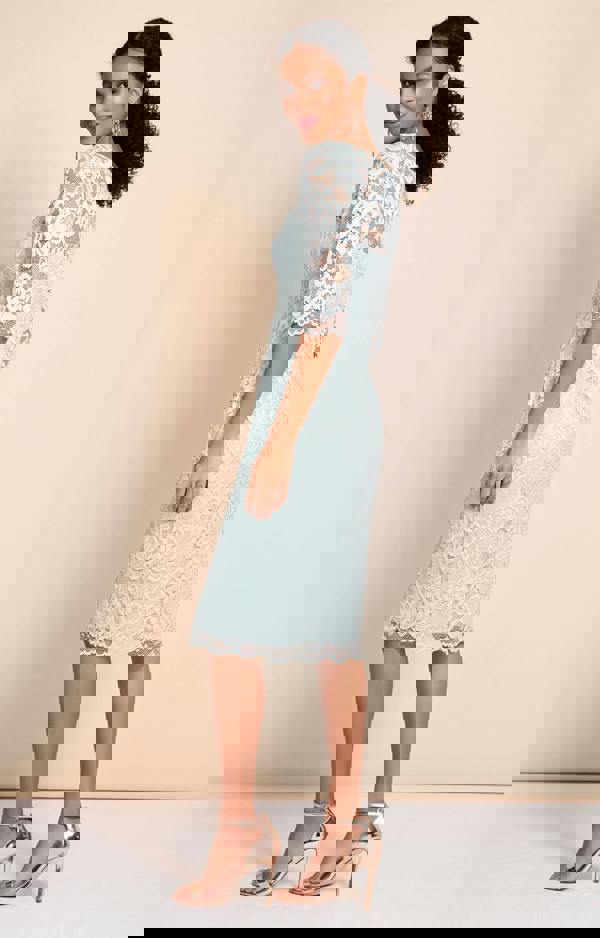 • Mint silver green stretch floral lace dress • Elegant high neckline with sheer lace detail • Soft stretch lace for a flattering sculpted silhouette • Premium breathable jersey lining for comfort • Three quarter length sleeves • Scalloped edging on sleeves and skirt hem • Made in Great Britain