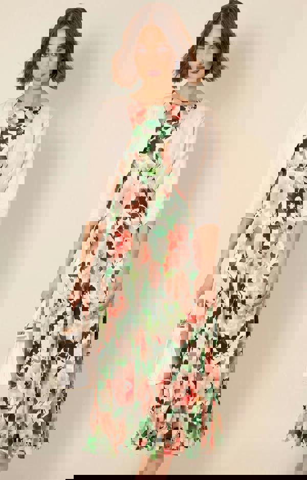 • Floral jersey midi dress in Peony Pink • Painterly floral print with peony tones and fresh green leaves • Classic boat neckline for a refined silhouette • Relaxed grown-on sleeves for subtle coverage • Softly shaped bodice with flattering empire waist • Flowing midi-length skirt for elegant movement • Premium fabric knitted and dyed in France • Discreet side pockets • Fully lined for comfort and a smooth finish • Made in Great Britain