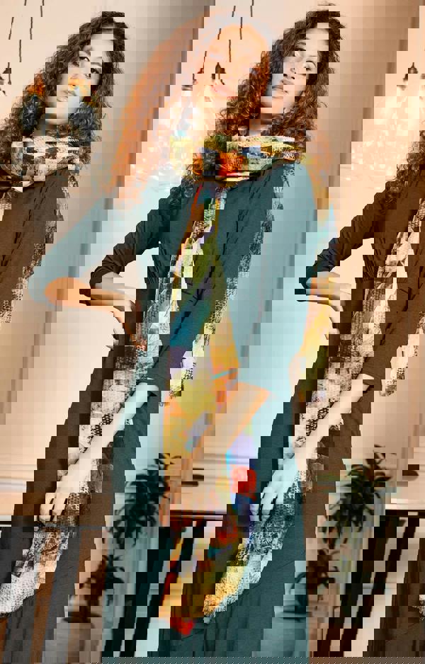 Made from a luxurious blend of wool and silk, the Mariselle scarf offers warmth, softness and breathability. The natural wool provides comfortable insulation, while the silk adds a smooth texture and subtle lustre that enhances the vibrant print.