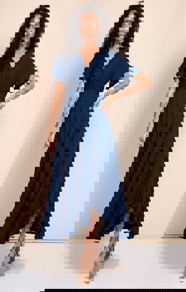 Step into effortless elegance with the Waterfall Dress in Navy by Alie Street London. Designed with graceful movement and a flattering silhouette in mind, this beautiful faux wrap midi dress combines delicate ruffle detailing with a timeless navy shade for a refined occasion look.