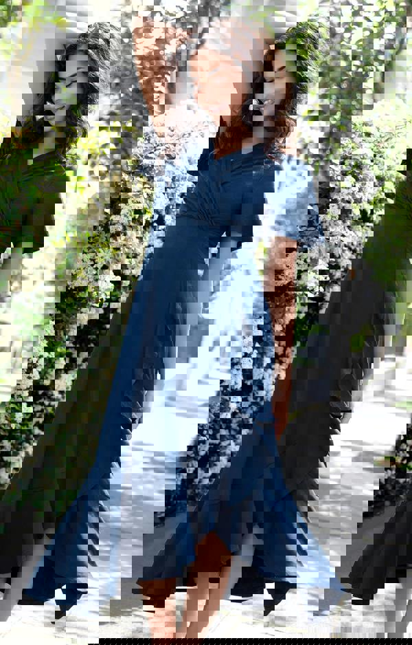 Designed especially for petite proportions, the Waterfall Dress Petite in Navy by Alie Street London offers elegant movement and a flattering silhouette for a variety of occasions. This beautifully designed faux wrap midi dress combines soft draping with delicate ruffle detailing to create a refined yet feminine look.