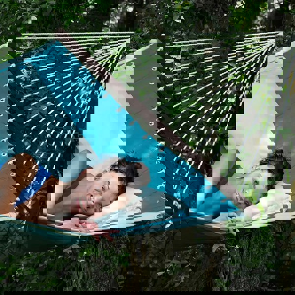 This softly padded hammock has a detachable cushion but is strong and large enough for a pet or child to join you in the hammock. The spreader bar makes it roomy, but can still be stowed easily.