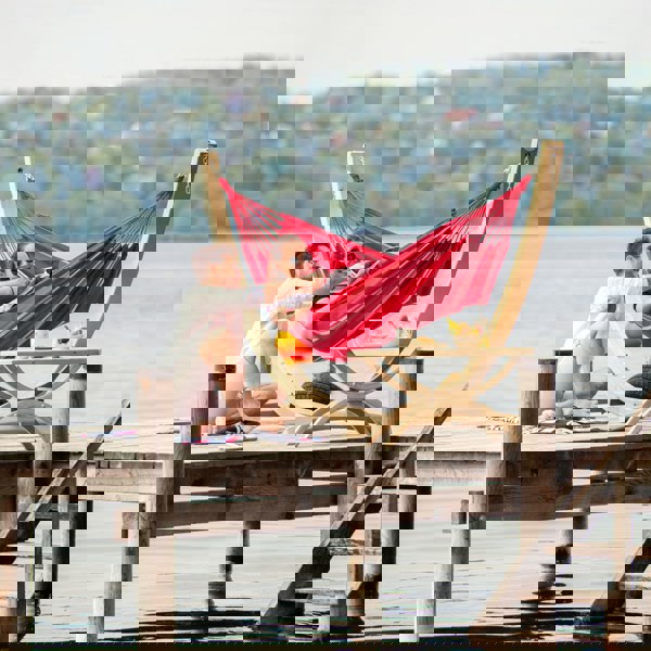 A stylish set featuring both the hammock and a gorgeous stand made from sustainable European Spruce. The rich contrast in colours provides perfect comfort and looks great. The Fuego Hammock is compact yet roomy (and very comfortable!). The Apollo Hammock Stand has been specially treated so it can be left outside – even withstanding our typical British weather! A great quality combination of stand and hammock, the ideal classy centrepiece for your garden.