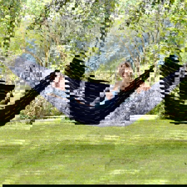 The Barbados Black Hammock is the perfect double hammock and one of our best sellers. The 400 g/m2 thick material is luxurious and very strong, holding up to 200 kg, and with a large enough lying surface for two adults.