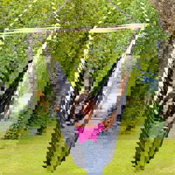 Almost as big as a lying hammock, but in a more traditional chair shape, the Brasil extra-large Black Hammock Chair looks stylish in black with white stripes. Supported by a sturdy piece of beech wood, and with extra thick woven cotton fabric, stitched at the edges, it is incredibly strong (in fact, it will hold weights of up to 150kg ) and it's very comfortable. Perfect for one person to curl up in the sunshine!