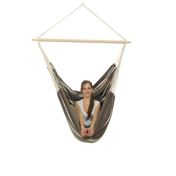 The Brasil Gigante Café Hammock chair really is massive, having enough space to fit two people, or one person with plenty of extra space to stretch out. The Brazilian cotton used to make this chair makes it very comfortable and relaxing to sit in.