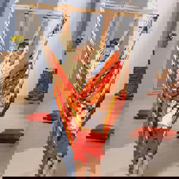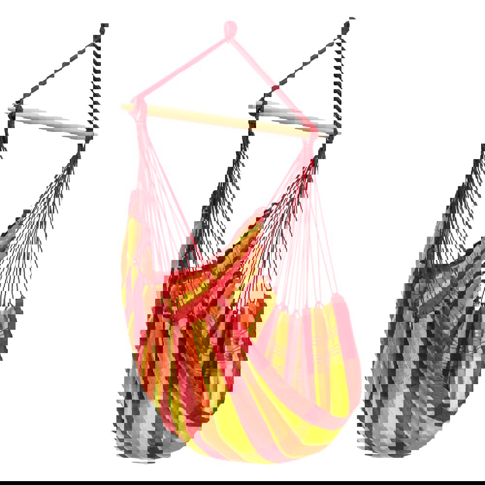 The Brasil extra-large chair is almost as big as a lying hammock, but in a more traditional chair shape. Supported by a sturdy piece of beech wood, and with extra thick woven cotton fabric, stitched at the edges, it is incredibly strong (in fact, it will hold weights of up to 150kg) and it's very comfortable. Perfect for one person to curl up in the sunshine!