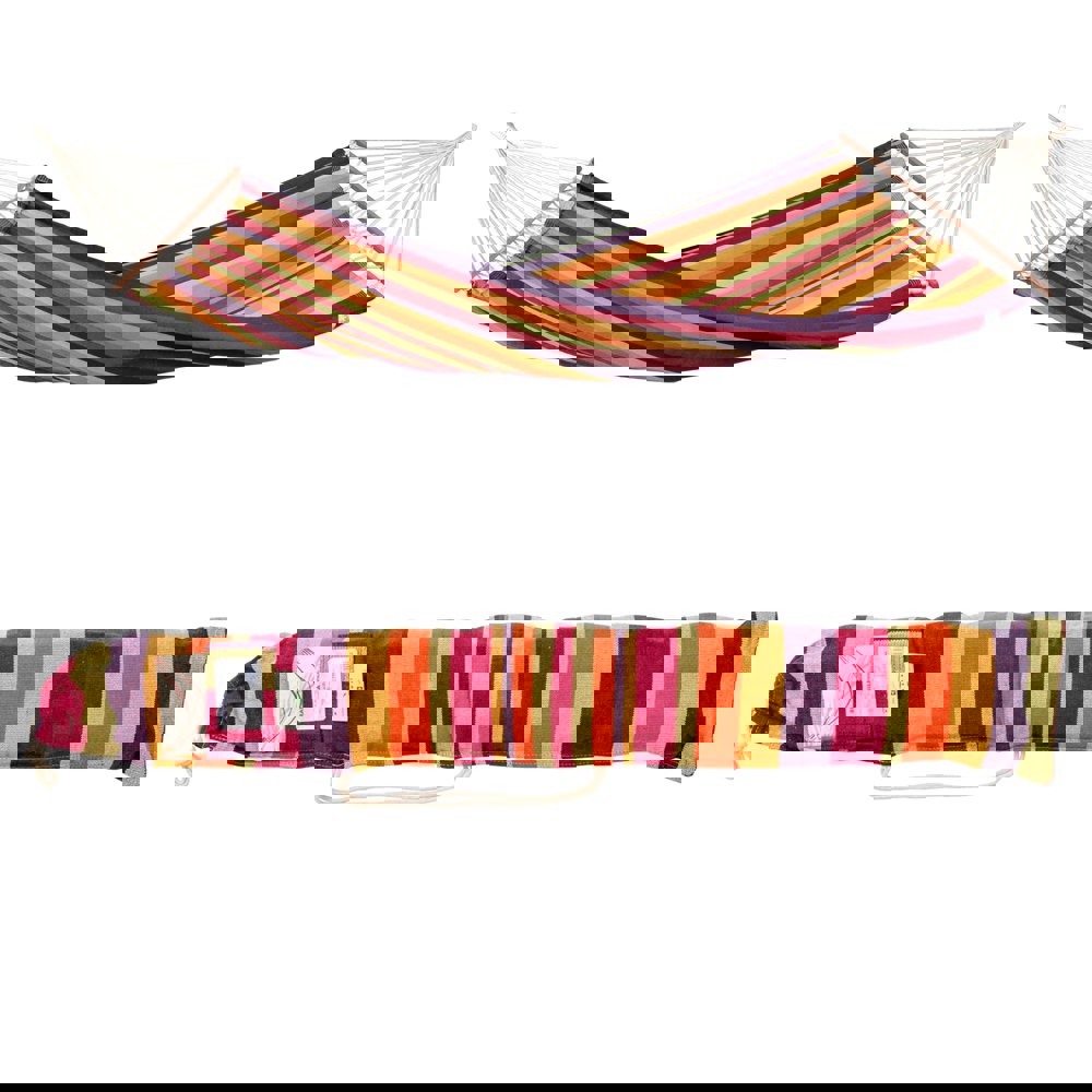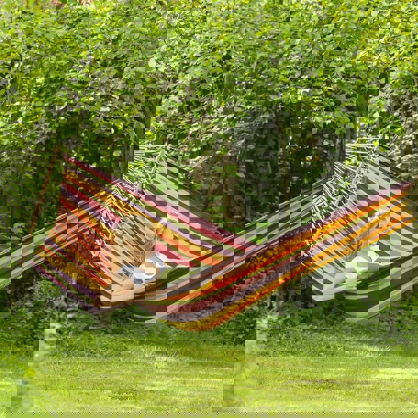 It has extra strong fabrics, braided cords and hardwood spreader bars to provide supreme strength and perfect comfort. The Tropical Hammock is durable, can be left outside and is supplied with its own matching bag for storage and portability.