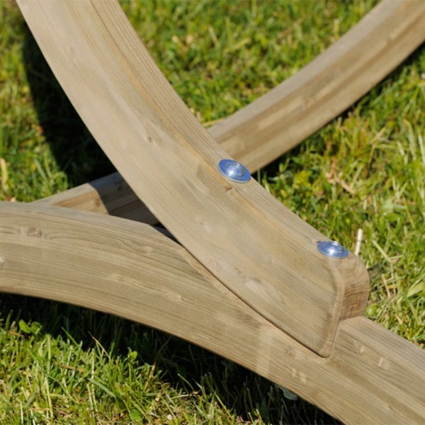 The Globo Hammock Chair Stand is made from spruce, which is weatherproofed by treating it in a dipping bath. The metal fixings are weatherproofed also as they have been galvanised. The Stand was developed especially for our ball frame ‘Globo Single Chair ’ (available separately)AMAZONAS stands like this one are produced from high-quality spruce (or larch) wood. They are all subjected to a bath impregnation process which gives the wood a green/olive hue and protects the wood from weathering, insects, and fungi - thus prolonging the life of the stand.