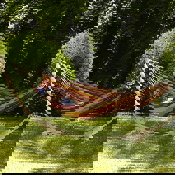 The Lambada Tropical Hammock provides a single hammock that is as spacious as it is comfy, as it has a larger width than most traditional single hammocks. The Brazilian cotton that the Lambada hammock is made out of makes it extremely comfy and also durable.