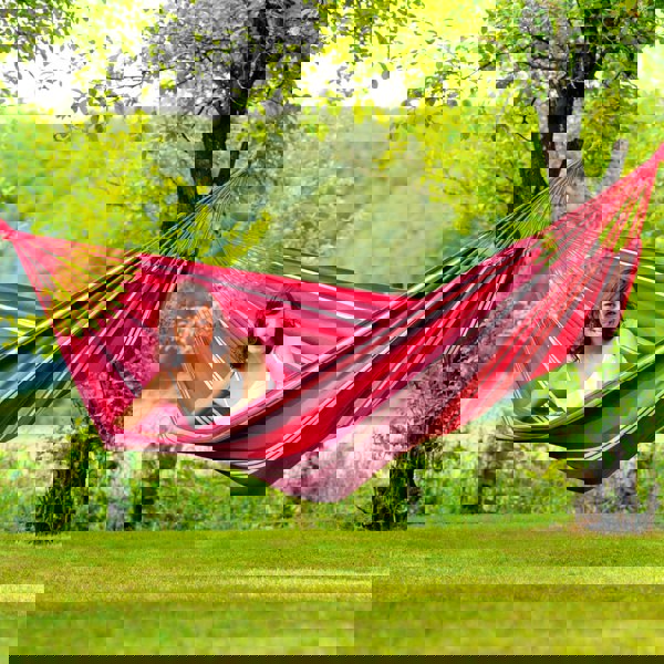 The hammock in typical Brazilian style made of weatherproof and UV-resistant EllTex material, which is extra long lasting and yet as soft as cotton. Leave a deep sag in the centre and lie in the hammock diagonally – that's the most comfortable.
