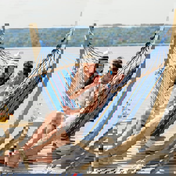 Comfortable and large, the Tonga Ocean Hammock is supplied with two hardwood spreader bars to create a spacious and cosy place for you to unwind. The Tonga Ocean Hammock is crafted from fine, soft cotton for perfect comfort. The fabric is also very strong, giving a maximum weight limit of 120kg. The unique matching colour, specially braided cords also help to increase the strength of this pretty hammock. In warm ocean colours all the family will love relaxing in the Tonga Ocean Hammock.
