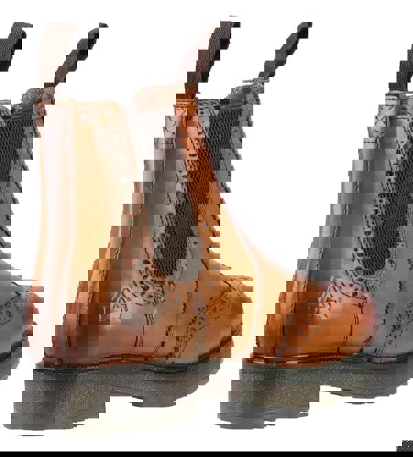 Unisex pull-on brogue dealer boot crafted with a tan full grain leather upper