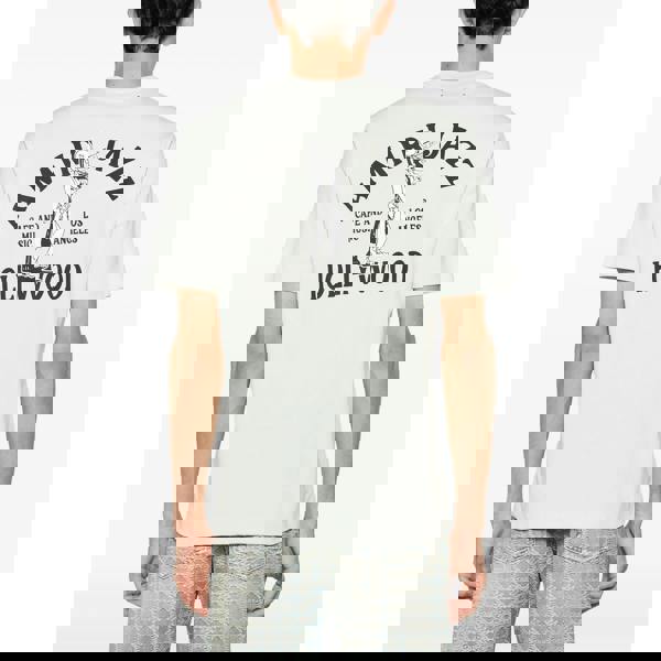 Crafted from soft cotton jersey, the Amiri Jazz Wolf T-Shirt in White offers breathable comfort and a clean silhouette. It features a rib-knit crewneck for durability and a refined fit. Distinctive logo and text prints adorn both the chest and back, providing a bold yet sophisticated graphic statement. This T-shirt combines quality materials with expert detailing, making it an essential piece for a contemporary wardrobe