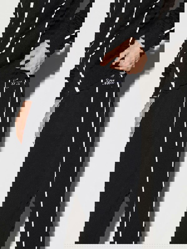 Black and white velour with piped-trim detailing, logo patch to the rear, drawstring waist, slip pockets to the sides, rear welt pocket, flared.