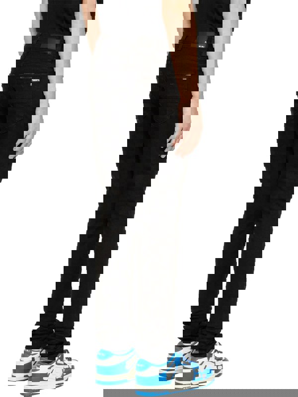 Skinny-fit stretch denim jeans in black. Distressing throughout. · Belt loops · Five-pocket styling · Zip-fly · Leather logo patch at back waistband
