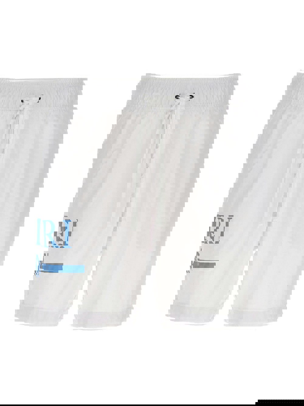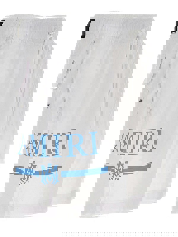 Amiri MA bar logo swimming trunks in tech fabric with light blue bar logo printed to side, elastic and drawstring at the waist and zipped pockets. Classic Amiri patch to the rear waist.