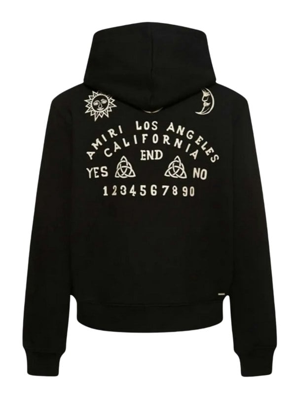 The Amiri Ouija Board Hoodie combines a striking design inspired by Ouija board symbols with the quality and style that AMIRI is known for. Multiple branded details adorn the front, back, and sleeves of this black hoodie, making it a unique and fashionable addition to any wardrobe.