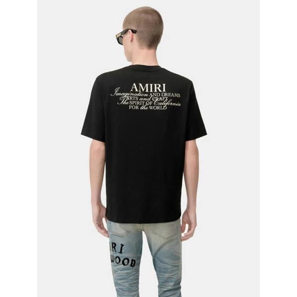This Amiri Spirit Logo T-Shirt in Black celebrates California's creative heritage with a distinctive chest patch and a bold back print expressing "Imagination and dreams, arts and craft, the spirit of California for the world. " Crafted in Italy, it offers a regular fit with a classic crew neck and short sleeves, combining expert tailoring with a statement design. Perfect for those who appreciate refined craftsmanship and meaningful fashion