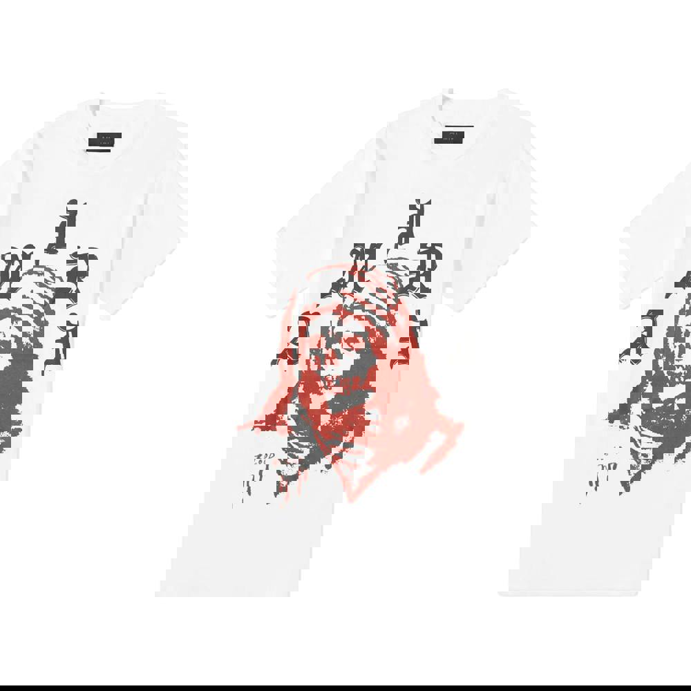 The Amiri Wes Lang T-Shirt in White unites high-end fashion with striking gothic artistry. Crafted from 100% cotton, this crewneck tee offers superior comfort and durability. Featuring Wes Lang's signature grim reaper motif beneath the iconic AMIRI logo, it delivers a distinctive, artistic edge that reflects the unique collaboration between two L. A. legends. Perfect for those who appreciate bold, contemporary design with a mysterious flair