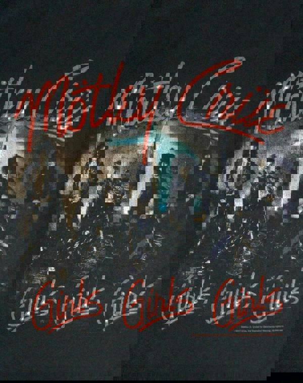 This vintage style Motley Crue sleeveless t-shirt features an awesome distressed photographic print of the iconic band, including members Nikki Sixx, Tommy Lee, Mick Mars, and Vince Neil, along with spray paint effect lettering of the band name and album Girls, Girls, Girls across the front of the garment