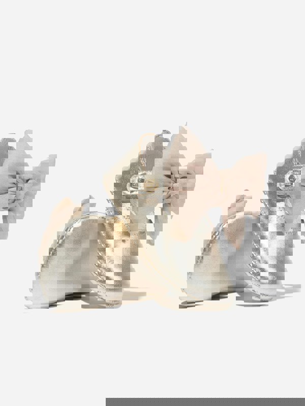 Baby girls leather bow shoes in gold by Andanines. Made in Spain for AW2024, this pair is crafted in Spanish leather with a gold finish and a bow detail.
