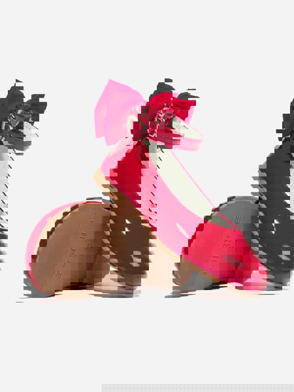 The glossy patent leather upper and bright red colour create a standout look, finished with a neat bow on the front.