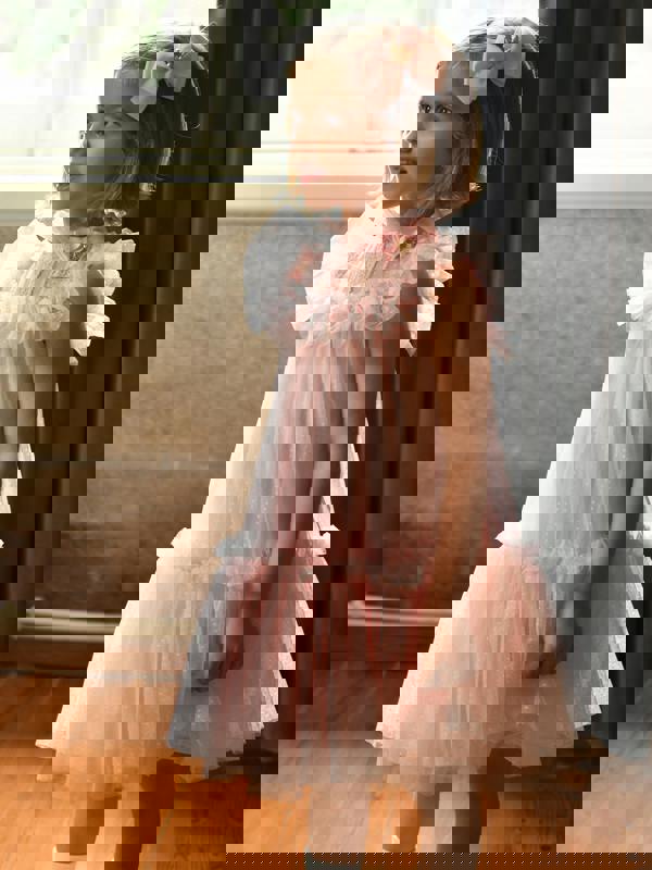 Angel’s Face brings a refined look to this Andrea dress in pale pink. The shell uses dotted tulle, paired with a yoke finished with pin tucks and heart lace. A ruffle trim runs around the yoke and continues over the shoulders to create cap sleeves. At the neckline, a ruffle detail sits alongside a grosgrain bow and charm.