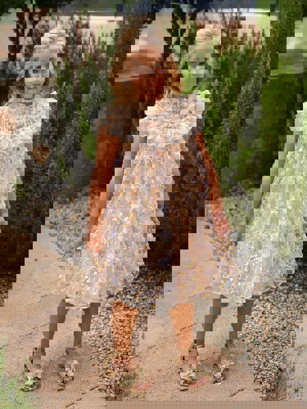 The Angels Face Girls Dominique Flower Sequin Dress comes in gold with sequin embellishments arranged in a floral design. The sequins add a light-catching finish that stands out with movement, making it a distinctive option for occasions where a more dressed-up look is required.