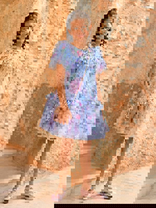 The Angels Face Girls Victoria Garden Flower Ruffle Dress in blue forms part of the SS2026 collection. A floral print in blue tones brings a bold, colourful look, while ruffle detailing adds movement and texture through the design.