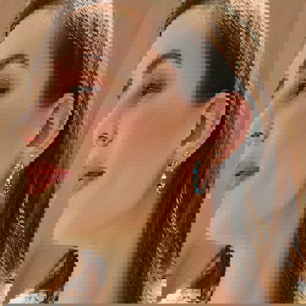 Brighten up your look with these elegant hoop earrings, crafted from rhodium-plated sterling silver. Featuring a striking mix of malachite, lab-created turquoise, and sparkling white cubic zirconia stones, they offer a perfect balance of vibrant colour and refined shine. Ideal for everyday wear or special occasions.