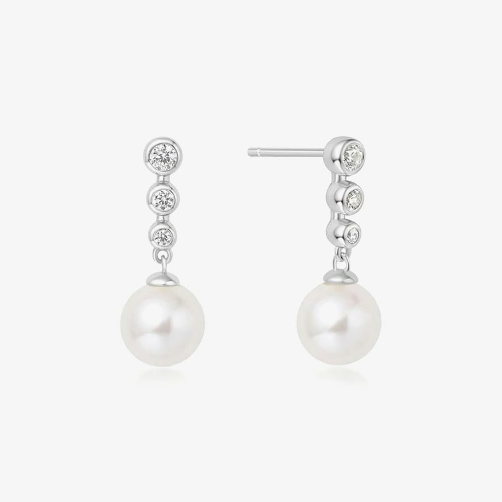 These elegant studs feature a cascade of graduated cubic zirconia stones that lead to a luminous shell pearl, reflecting timeless style and grace. Perfect for both everyday wear and special occasions, they pair effortlessly with other earrings for a versatile look. Crafted from rhodium-plated sterling silver, these refined dropper earrings also make a thoughtful gift for someone special.