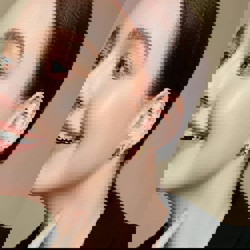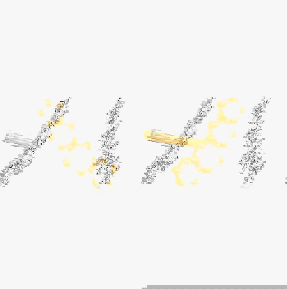 These sparkling climber studs, crafted from 925 sterling silver with 14ct gold plating and set with radiant cubic zirconia, are inspired by the brilliance of shooting stars. Designed to sweep elegantly along the earlobe, they bring a celestial shimmer to any look. Style them with bold huggies or hoops for a standout ear stack.
