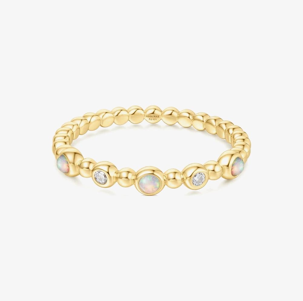 Elevate your style with this exquisite 14ct gold-plated sterling silver ring. Featuring bezel-set Kyoto opals, surrounded by sparkling white cubic zirconia stones, this ring is enhanced with a delicate beaded design for added texture and sophistication. A perfect blend of modern elegance and timeless charm, this ring makes a stunning statement.